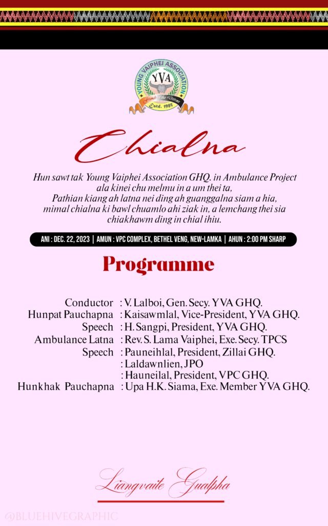 Hun sawt tak Young Vaiphei Association, General Headquarter in Ambulance Project ala kinei chu amelmu thei ah ium tak ziak un Pathian kiang a latna nei ding lem aki sa, kuama mima chial na ki bawllo ahin, alem chang thei sia chia khawm din iki chial ui.