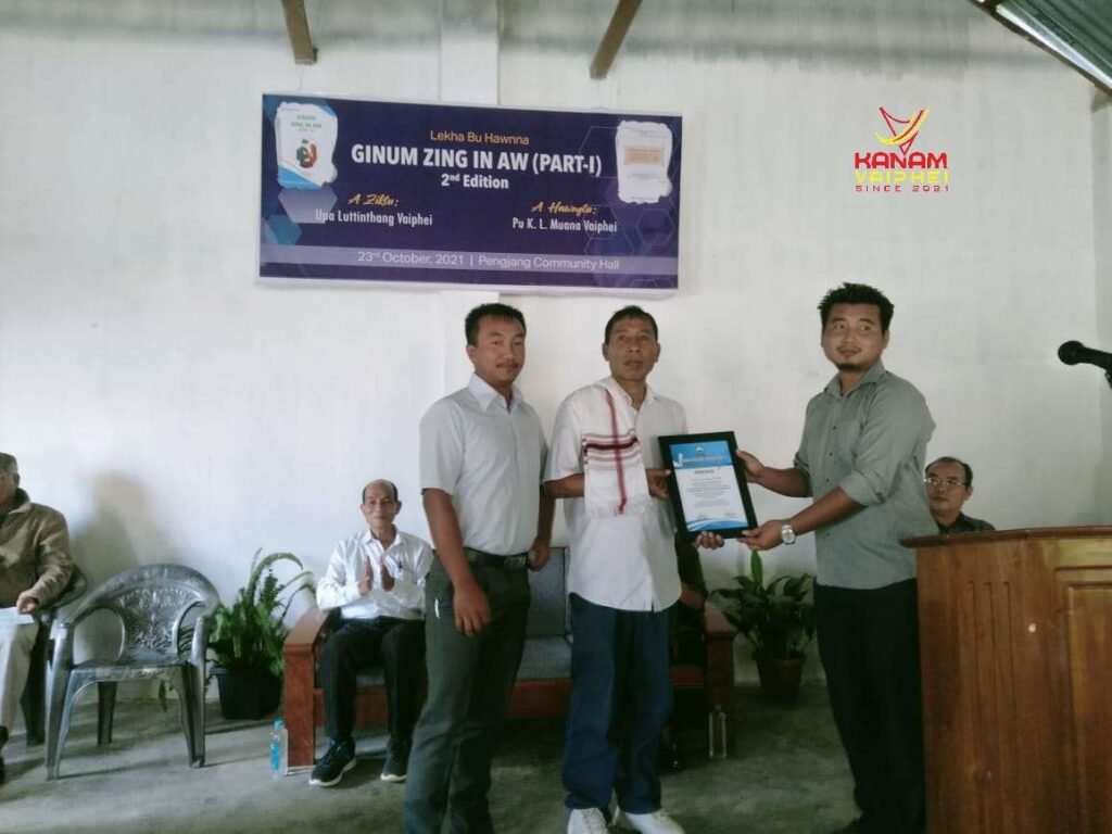 Pu KL Muana Vaiphei in The Vaiphei novel lekhabu, Ginum zing in aw (Part- 1), 2nd Edition hawndawna tuni 22nd October, 2021 in a nei hi. Lekhabu a genna’n a min mai hinle khawvel gam leh thagau gam a ding in ginum na a pawimaw dan akilang mama hi. Literature sukhat na ding in lekha zik habawl ah, I literature matdan in I khawtang salvak zo nailo ahiziak in khangthak lekha thiam taktak te’n lekhazik lam hung hakat zel ding in tilkhona a gen hi. Nam mipite chengbum lo maleu hin literature lam hatsak leu hin khat leh khat kisuikhawmna leh pankhawmna hatzaw sem um thei ding ahi. Khangthak te’n laa lampang ah gospel, love song leh a dangdang phuak tam po leu hin I khawtang ah pau leh ham, lekhazik masawnna um ding ahi.
