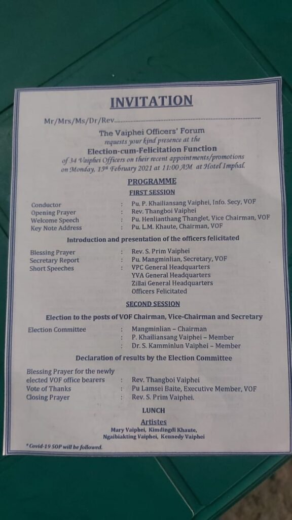 Vaiphei Officers’ Forum saina nuai ah a hungtung ding February 15, 2021 zingkal lam dak 11:00 leh Hotel Imphal mun ah Election tawh kithua in tunaicha Vaiphei officer tingthak leh kaisang thak mi 34te kipakpina programme mang ding a hiu. Officer ting thakte chu Rev S. Prim Vaiphei in malzawl dawtpiakna pauchapna nei intin, VPC, YVA leh Zillai GHQ a kipat le thugenna um ding a hi. Zia zaw chuleh VOF puitu thak ding Chairman, Vice Chairman leh Secretary ding telna le um ding a hi.