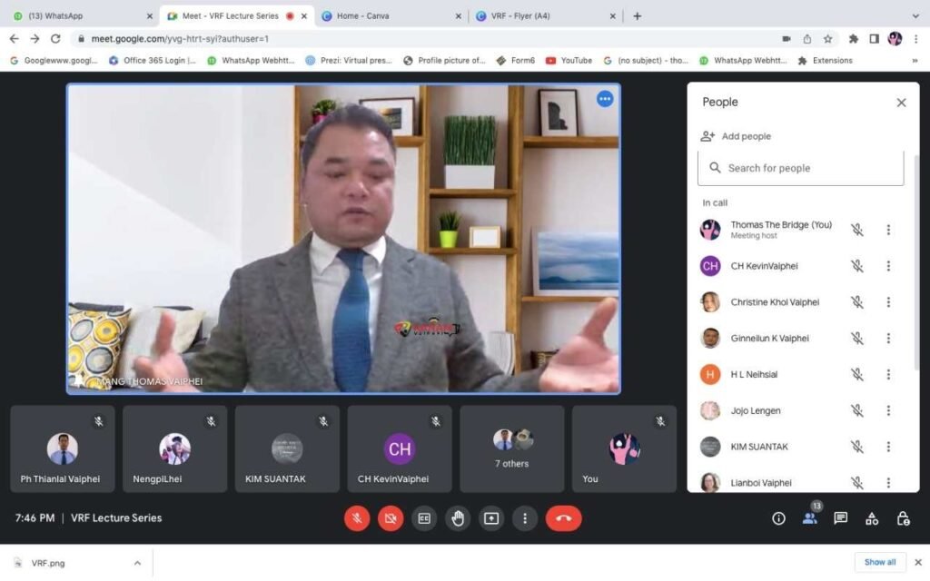Zia gual VRF in zani VRF Webinar Series 4.0 thupi; The Church/Christian Mission and its impact in the state of Manipur (Religious initiative in society of Manipur) hun mat nat lawk tak a zo thei uh ahi dan thu hiat ahi. Zia hun a hin *Za um Pastor Dr. Mang Thomas Vaiphei speaker a pang in thu man tam tak gen daw aum in Inam sung a tung le khan to thei na ding tamtak gen daw in aum hi. Zia gual a hun mat thei ding avaihun guang tu Ms Lianboi Professor, President VRF, Zaum Thomas Haukham Secretary VRF leh a member te ban a hun hawn na mang tu Rev. P.Thianneilal te chung apan lak nau thupi isa mamau.