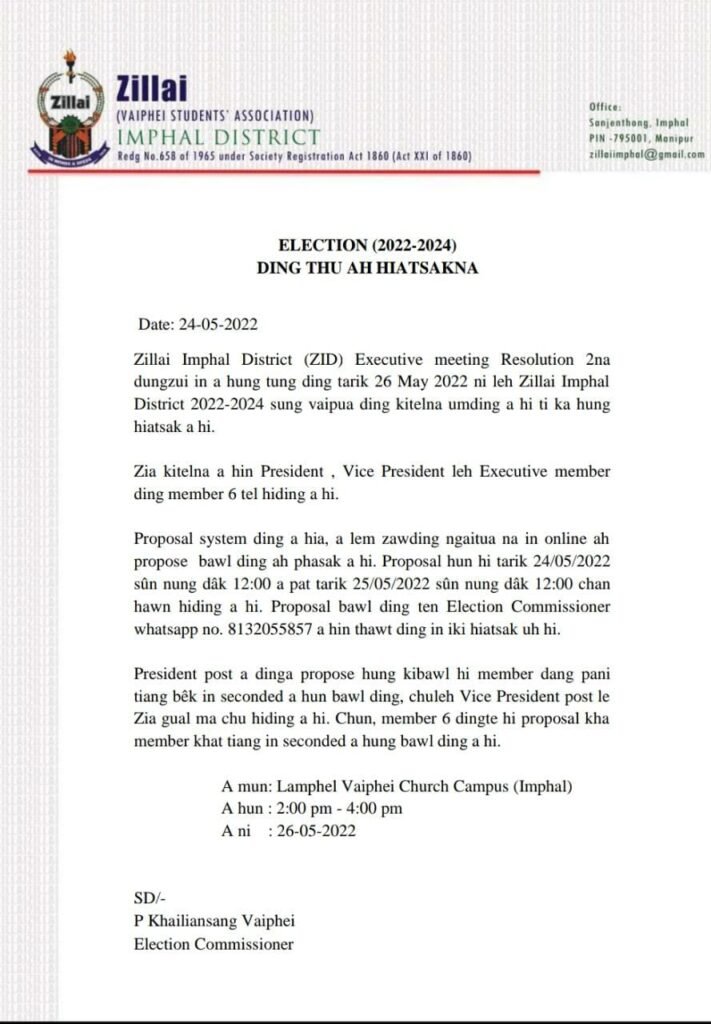 Zillai Imphal District (ZID) Executive meeting Resolution 2na dungzui in a hung tung ding tarik 26 May 2022 ni leh Zillai Imphal District 2022-2024 sung vaipua ding kitelna umding a hi ti ka hung hiatsak a hi.